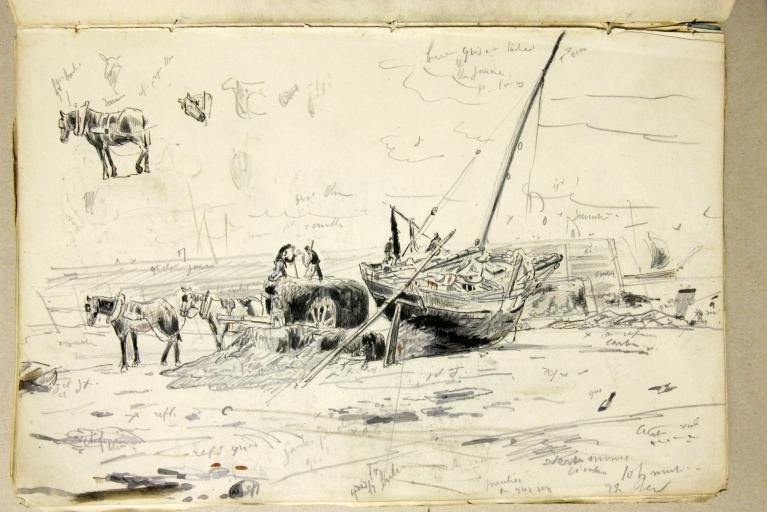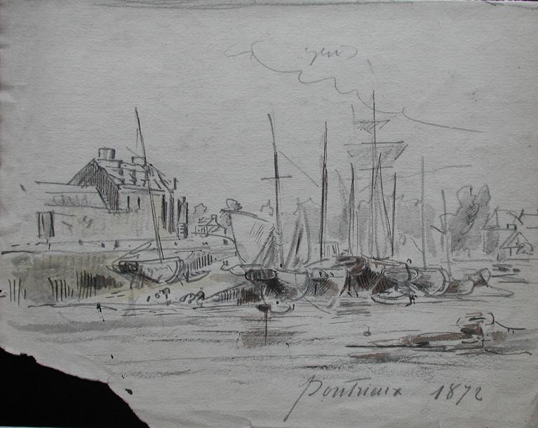 Huiles sur carton, fusains, lavis, papier quadrillé, formulaire administratif reconverti au dessin, crayon sur papier d'emballage, carnets de voyage d'un promeneur solitaire, tout est bon et utile pour transcrire un langage manuel, exprimer la fantaisie du peintre, le dit des grèves et les regards d'estran.