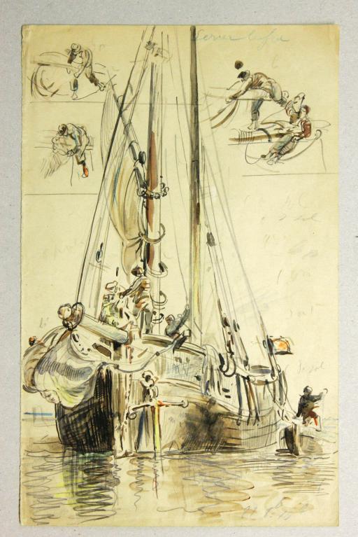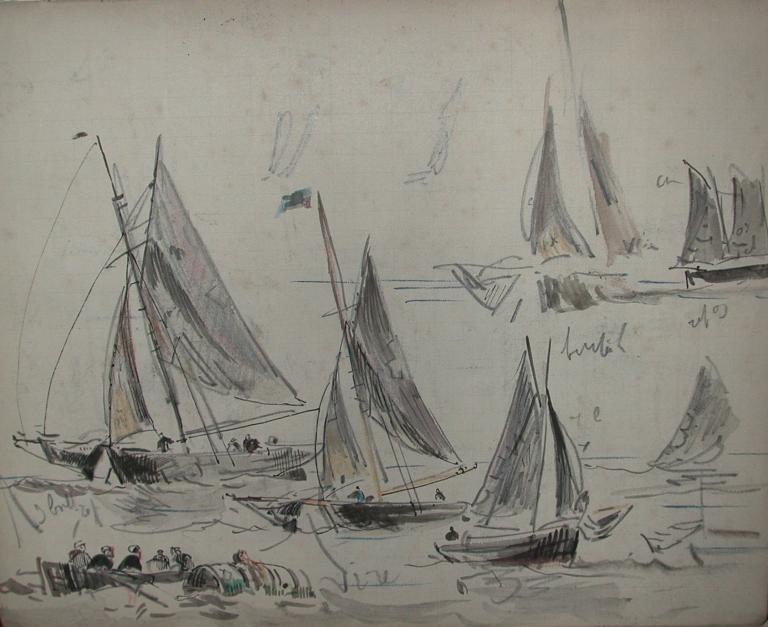 Du port de Lézardrieux à l'embouchure du Trieux, devant le poste de douane de l'île aux douaniers, édifié en 1914, dans les différentes rades de Coëtmen à l'anse des Perdrix, le peintre saisit en franchise colorée, sur le motif, en aplats de couleurs, en courbes naisssantes et presque en chromophotographie les virements des bateaux autour des tourelles-balises bi-colores, avec les voiles de coton jaune-oranger. Il esquisse au crayon une vie maritime intense, une scène de pêche à la senne proche du rivage, un bateau de travail en manœuvre, au mouillage, voiles à sécher dans les haubans, gabiers dans les enfléchures, avec des touches colorées, fragmentées, transparentes de lumière agitée. Gestes, postures, attitudes des gens de mer et des gens de terre donnent l’occasion au dessinateur de confondre son style à ce qu’on appellerait aujourd’hui de la BD, avec toujours une pointe d’humour et d’empathie.