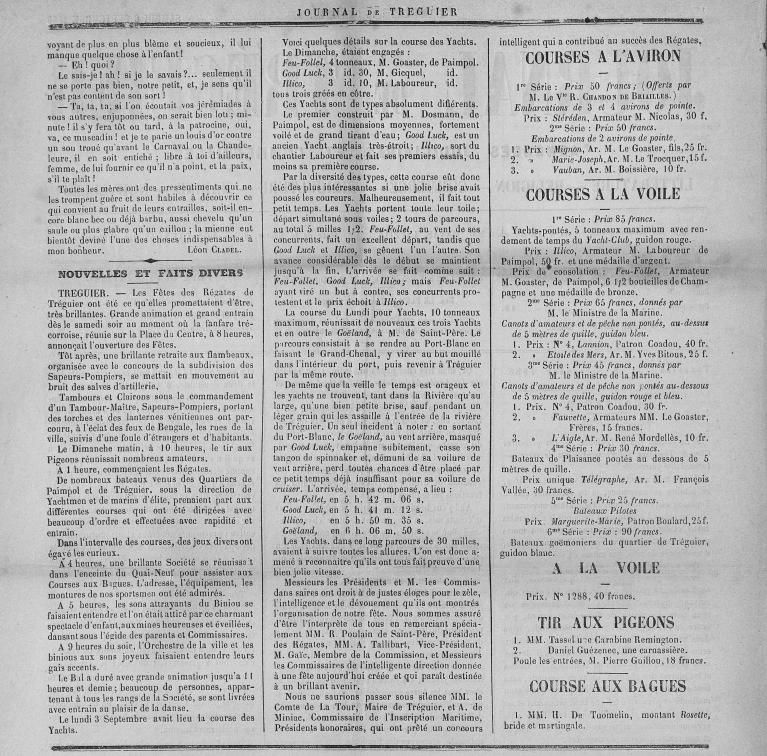 A la fin du 19e siècle sont organisées les régates de Tréguier comme le relate Le journal de Tréguier dans son édition du 2 septembre 1888. Après les préparatifs du samedi soir : concert de fanfare, défilés aux flambeaux des Pompiers avec lanternes vénitiennes et le tir aux pigeons, hors d’œuvre de dimanche matin, le départ des régates est donné à 13h00. Pendant la course de nombreuses activités sont proposées et la soirée se termine par le bal habituel.