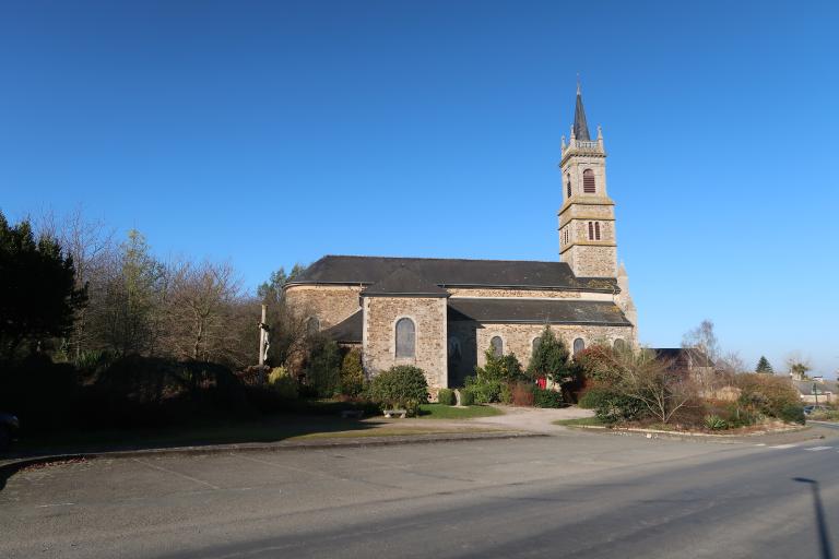 L’église Saint-Jacques-le-Mineur a été construite par Fossey en 1846, sur un nouvel emplacement, proche de l’ancienne église, mais de l’autre côté de la route, à l’angle de la rue de l’Hermine et de la rue de Bécherel. La date de 1846 apparait en façade d’entrée, au nord. Elle est bénite le 25 septembre 1847. Le clocher est consolidé en 1878. Les 14 vitraux ont été posé plus tardivement en 1888 et sont fabriqués à Angers par l’atelier Megnen, Clamens et Bordereau. (Vitraux signés et datés, restaurés 1939). Ils ont été offerts par les prêtes de la paroisse, les abbés Renault, Amyot, Jean Corseul, Charles Letellier, Emile Menard, vicaire, François Hamon, Joseph Guilhot, leur famille et d’autres fidèles : Marie-Ange de Champsavoir, Sophie Cardon, Jean Dutertre, Joseph Gaultier et Marie Henri, la veuve Lapie et ses enfants, François Rault et Jeanne Rault, Joseph Rault, la veuve Hubault, Agathe Hubault et Anne Pellerin, R. Calve, René Morvan, Jeanne Auffray et Jean Rolland Cochet, François Bouesnard, Marie Briand, Jacques Bourde, Julienne Thoreux, Jean Thoreux, sœur Adèle-Marie… Le décor peint du lambris de couvrement et des arcades, rinceaux et médaillons sont de la fin du 19e siècle.