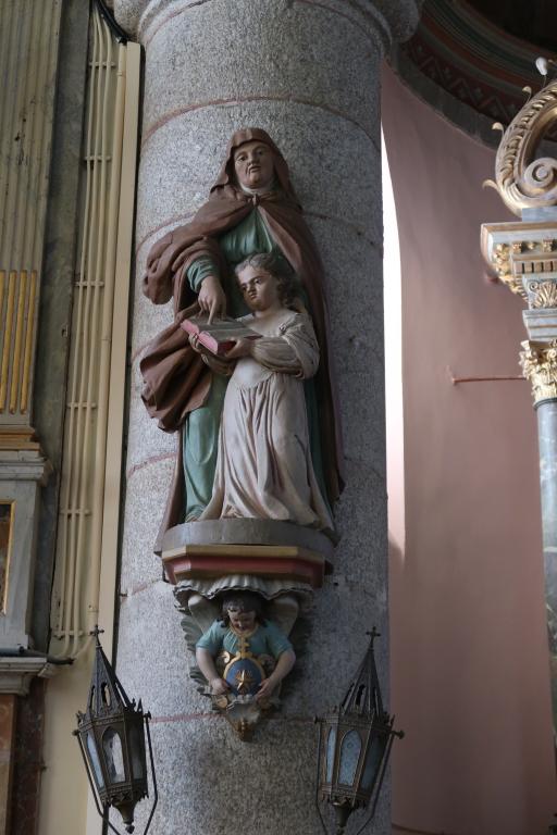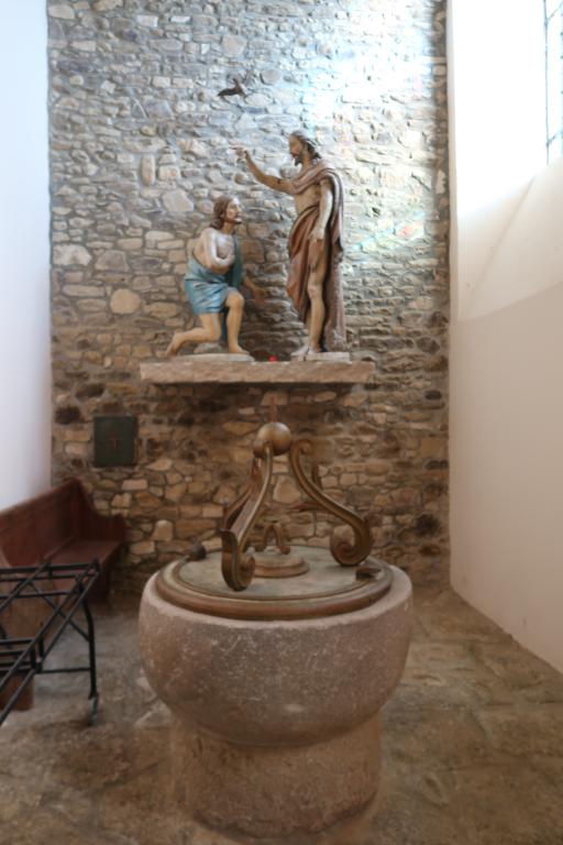 L’église abrite également quelques statues anciennes du 18e siècle et un groupe sculpté du baptême du Christ de la même période. Le maitre autel à baldaquin, dans le style du 18e siècle, a été réalisé au 19e siècle. Des autels du même type à pattes de lion, se retrouvent à Saint-Erblon (35), refait en 1841 et également à Hédé (35) en 1882.