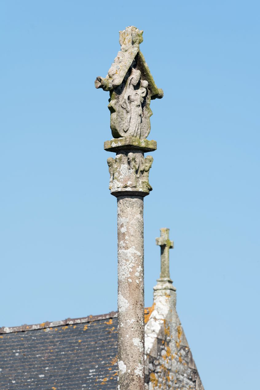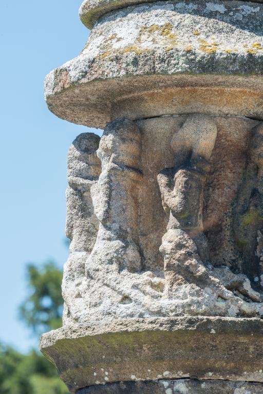 "Remontée au 18e siècle sur un emmarchement qui en accroit encore le caractère imposant, elle s’élève sur une puissante base prismatique moulurée, entourée par une table carrée portée par des colonnettes dont les bases et les chapiteaux à crochets bourgeonnés sont bien du 13e siècle finissant ; au-dessus de la table, le départ du fût est constitué d’un large tambour monolithe circulaire sculpté de neuf personnages agenouillés, dont les tuniques longues trahissent la même époque ; le fût, de section ronde, est très élancé et se termine par un petit tambour formant chapiteau, orné lui de six personnages agenouillés ; au sommet, enfin, un panneau quadrilobé sous un auvent fleuronné porte à l’est une Vierge à l’enfant et à l’ouest le Christ en croix entre Marie et saint Jean. L’ensemble est très cohérent par le matériau, la facture et les proportions : il ne s’agit donc pas, comme cela a pu être dit, d’un monument composite fait de pièces et de morceaux."