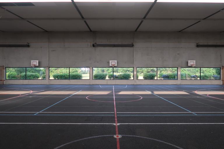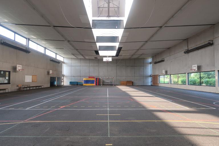 - Le gymnase proprement dit qui nécessite une hauteur sous poutre de sept mètres aura donc une hauteur hors tout équivalente au collège (R + 2). Traité en matériaux gris, il reprend les tons du collège pour minimiser son impact visuel. L’ensemble est également allégé par l’acrotère plus foncé et les vitrages.