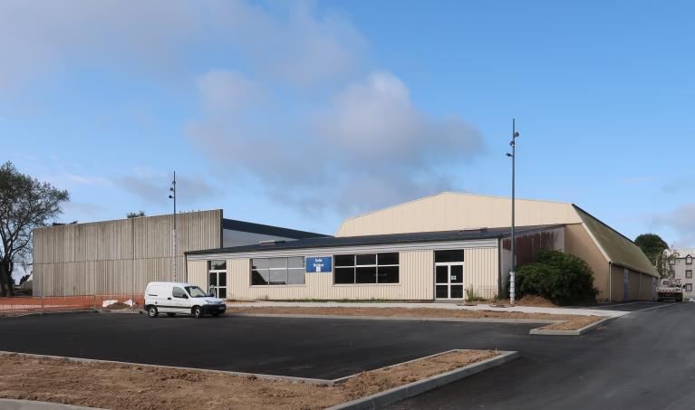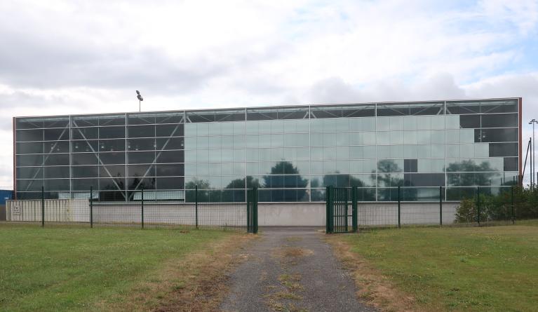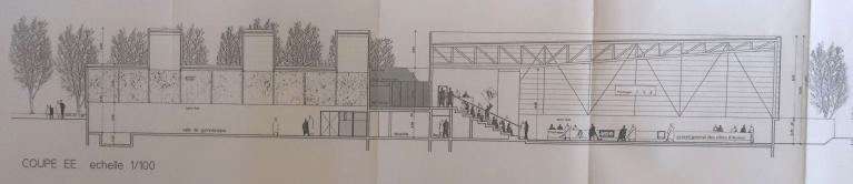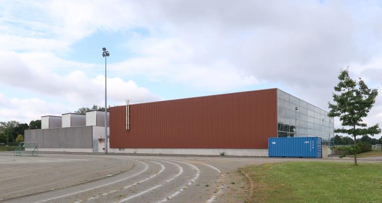 La construction se déploie en L avec, en frontalité de l'accès, une passerelle qui mène au hall public. La salle de gym s'installe latéralement au niveau bas, répondant et accompagnant ainsi le rideau végétal jouxtant les terrains de football à l'ouest. Ceci permet de créer une séquence d'entrée où l'espace est tenu et, traité sous forme d'un jardin, il donne l'identité du lieu et sa structure. C'est un lieu déjà intériorisé qui annonce le bâtiment. [...] L'éclairage naturel se fait essentiellement au nord afin d'éviter les phénomènes de surchauffe et d'éblouissement par un bardage translucide. La grande salle est traitée en bardage métallique couleur bronze ; le hall public, plus bas, et traité en panneaux de bois stratifiés extérieurs de couleur noire, permet de minimiser ce grand volume en venant en premier plan. La salle de gym est traitée en panneaux de béton sablé préfabriqués dont le calepinage et la matière redonnent une échelle à l'ensemble. Cette salle est rythmée par des sheds émergeant tous les 6 m de sa toiture et faisant le lien avec la hauteur du volume de la grande salle. En perception lointaine, ils seront le signal de la salle.
