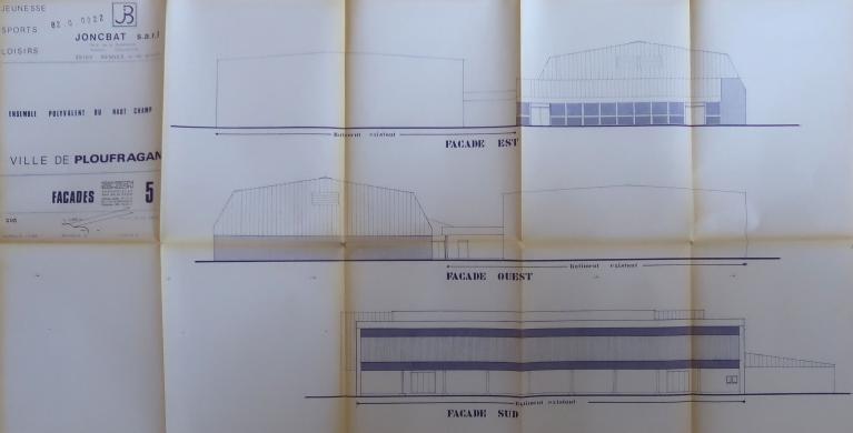 La salle étant partiellement enterrée, la composition des façades fait apparaître un soubassement en béton lisse. Ce soubassement est surmonté de bardage métallique ou de béton préfabriqué formant le corps du bâtiment et les sheds de la salle de gymnastique apparaissent comme un couronnement de celle-ci. Cette composition permet d'intégrer les différentes hauteurs tout en donnant une perception d'échelles différentes suivant l'endroit d'où est perçue la salle." (Notice du volet paysager)
