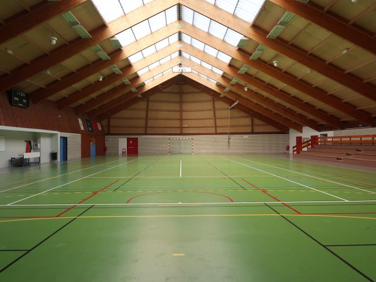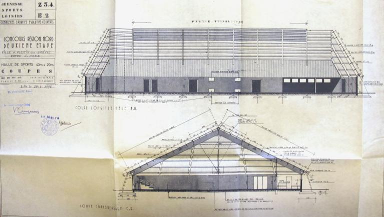 Halle de sports COSEC modèle Abadie, mise en œuvre par l'entreprise lilloise Joncquez. Aire de jeux de 40 m x 20 m avec tribunes.