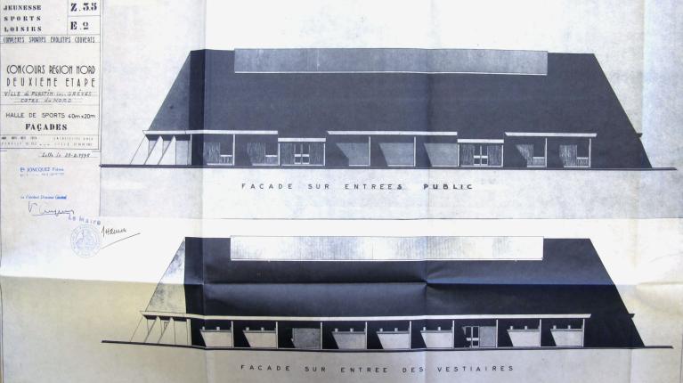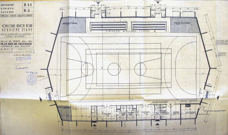 A l'instar d'une vingtaine de communes bretonnes, Plestin-les-Grèves a choisi un modèle de COSEC lauréat du concours régional dans le Nord et non en Bretagne-Pays de Loire. Cette halle, conçue par une équipe d'architectes réunie autour de C. Abadie et par l'entreprise Joncquez, est toujours plébiscitée par ses utilisateurs, au prix de rénovations périodiques.