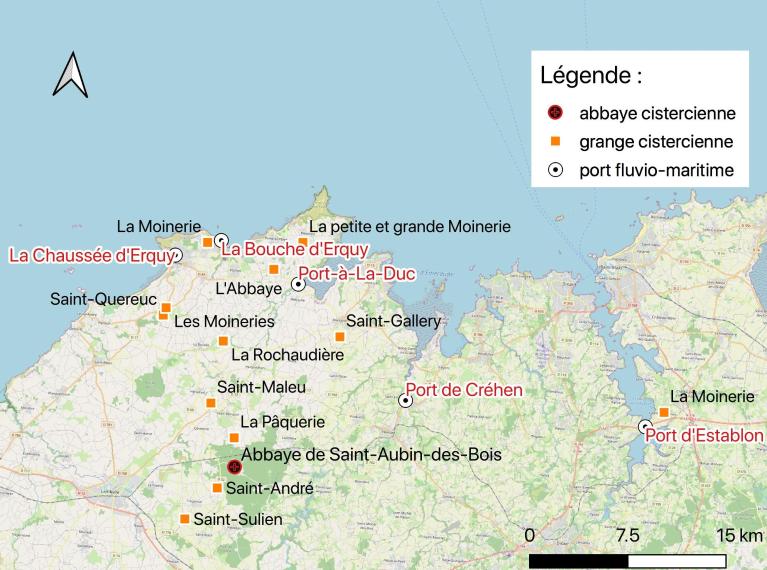 Les granges de l'abbaye cistercienne de Saint-Aubin-des-Bois se situent en majorité dans le Penthièvre littoral sur les communes d'Erquy, Fréhel, Hénansal, Hénanbihen, Matignon et Saint-Rieul. La grange viticole de la Moinerie à La Ville-ès-Nonais, dans le département d'Ille-et-Vilaine, constitue une exception : son éloignement est lié à la réputation des vins sur la commune de Saint-Suliac au Moyen Âge sur le bord de la Rance. Les cisterciens organisent alors, à partir de leurs granges, une production agricole et artisanale dont une partie est écoulée sur les marchés locaux ou urbains dans leurs maisons de ville à Lamballe et Dinan.
