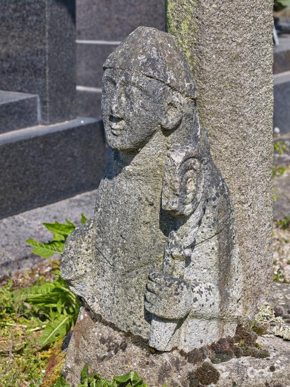 Au pied de la croix a été placée un buste en pierre d'un saint abbé (tête couverte, main tenant une crosse), non identifié.