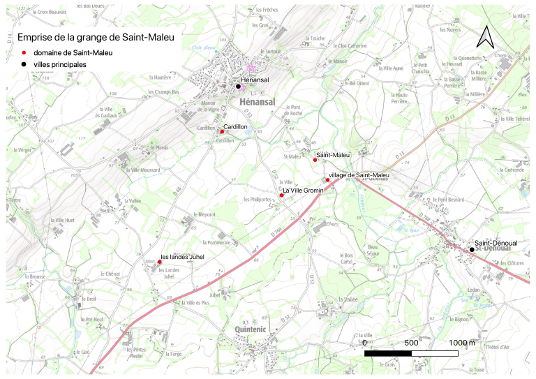 Implantée au bord d'un grand chemin reliant Lamballe à Matignon et Plancoët, la grange de Saint-Maleu se situe à la confluence d'un ruisseau et de la rivière du Frémur. Son aliénation au 16e siècle fait perdre de nombreuses informations sur le domaine, néanmoins, son terroir s'étendait sur les communes et paroisses de Quintenic, Saint-Dénoual et Hénansal et les villages de Cardillon, La Ville Gromin et Les Landes Juhel. Le lieux-dit actuel de Saint-Maleu constitue l'ancien enclos résidentiel de la grange, alors que l'actuel village de Saint-Gueltas représente l'ancien village de Saint-Maleu implanté au bord de la départementale 768. L'organisation topographique de la grange est identique à la grange de Saint-Gallery sur la commune de Matignon.