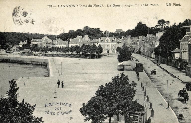 Au 13e siècle, la ville se développe autour du château. Les bords du Léguer constituent des lieux d’échouage. Il n’y a pas de quai en pierres mais seulement des berges en pente douce sur lesquelles des madriers forment une estacade. Des pieux dressés çà et là permettent l’amarrage des navires. C’est ainsi que se présentait la berge, lieu de débarquement des marchandises, avant la construction du quai d’Aiguillon.