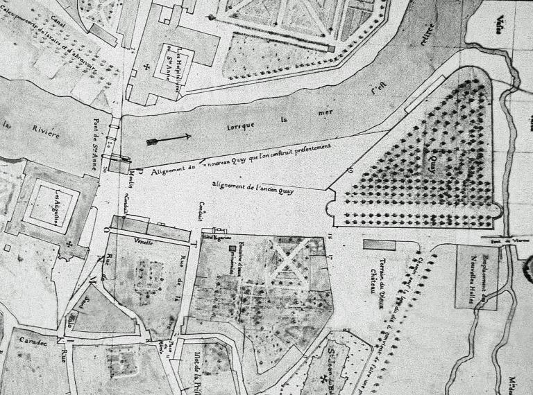 Le 18e siècle est celui de la grande transformation des quais en rive droite, en amont de l’anse de Viarmes, dont les équipements sont assez rudimentaires. Il s’agit d’une estacade de bois et un quai vertical en piteux état nécessitant des réparations constantes. En 1735, les autorités locales demandent à l’Intendant de Bretagne de les faire réparer. Le quai dit d'Aiguillon doit sa construction à Emmanuel de Richelieu, duc d'Aiguillon, lieutenant général du Roi en Bretagne et commandant en chef de la province de 1753 à 1768. Il profite de la fin de la période d'aide financière de la France à la Bretagne suite au rattachement du Duché en 1532. En 1760, année où il est président des Etats de Bretagne, il obtient le versement de 10 000 livres pour démarrer les travaux. L'ingénieur du roi, Magin, est chargé du projet : il s'agit d'augmenter la surface du quai précédent depuis le moulin du pont de Sainte-Anne jusqu'au quai de Viarmes, terminé en 1753, suivant une ligne droite, avec une cale à deux rampes. Les travaux débutent en 1762, mais le chantier est arrêté peu après. Ce projet ne satisfait pas les bateliers car il accroît l'étendue du quai au détriment de la rivière. Le chenal est trop étroit et il génère ainsi un courant violent contre le mur de revêtement qui rend impossible l'amarrage des bateaux lorsque la rivière est grosse.