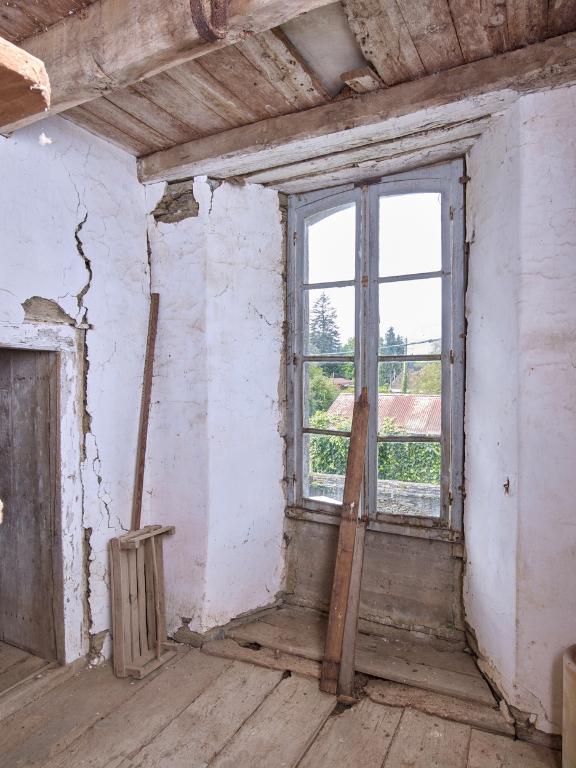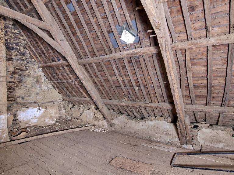 La maison en moellons de schiste, orientée à l’ouest, est perpendiculaire à la route. La cour avant est délimitée par des murs de clôture qui la protègent de la route et par les deux piliers de l'entrée. Elle présente un plan allongé à un étage et une façade ordonnancée à trois travées. Des emplacements de lucarnes sont visibles dans la corniche moulurée en granite qui couronnent la façade. La porte-fenêtre centrale de l’étage donne sur un balcon en fer forgé qui repose sur des consoles sculptées. La distribution intérieure est semblable aux autres maisons de marchands de toile : un escalier central à retours dessert deux pièces à feu par niveau. La cheminée de la chambre sud du premier étage conserve un linteau sculpté. Un appentis destiné à stocker les fûts de cidre est construit contre la façade postérieure.