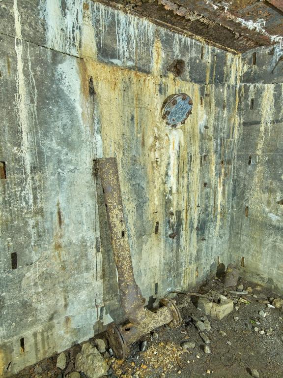 A l’intérieur, se trouve une grande soute rectangulaire aménagé dans le sol qui le distingue du plan-type original. Un poste d’observation et de tir dit Tobruk est accolé au Nord afin de permettre sa défense rapprochée.