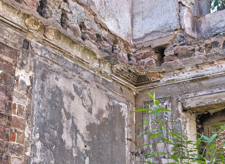 L’incendie a détruit la couverture, la charpente, les planchers, l’escalier et de nombreux éléments de second œuvre. Il laisse apparaitre les poutrelles métalliques tordues qui soutenaient le plancher de l’étage. Ne subsistent que les murs en maçonnerie et quelques éléments qui ont résisté à la chaleur : les volets métalliques, les radiateurs, le lustre en fer forgé du vestibule d’entrée, les portes-fenêtres Sud avec leurs huisseries en bois et les plombs des vitraux, sur les murs du papier peint aux motifs floraux... Le salon japonais situé au Sud conserve partiellement son décor néo-classique en stuc du plafond et les traces des boiseries disparues sur ses murs recouverts par des graffitis.