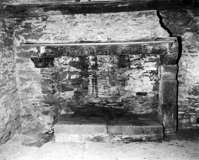 Escalier dans oeuvre en vis (bois) disparu ; sol partiellement couvert de dalles de schiste.