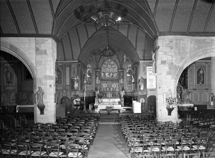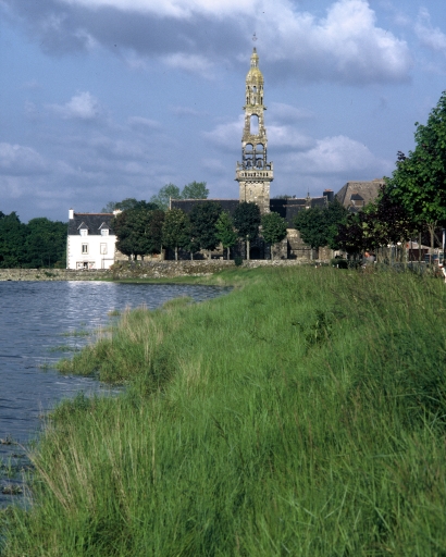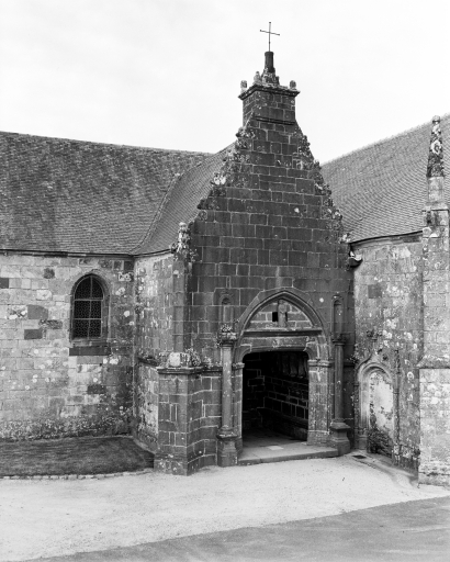 Ancienne croix de cimetière datée 1526 déplacée dans le cimetière actuel. Eglise à chevet plat achevée au milieu du 16e siècle (date portée 1544) ; conservation de sablières et de blochets contemporains dans l'angle sud ouest du transept. Porche sud érigé entre 1598 et 1613. Massif occidental, tour, clocher et lanternon construits entre 1628 et 1647 avec remploi d'une porte datant du milieu du 16e siècle. En 1680, transformation du chevet plat d'origine en chevet à pans multiples (chevet Beaumanoir), rajout de la sacristie nord et obturation des baies du choeur et du transept lors de la mise en place de retables et de lambris. Au 18e siècle, doublement présumé du transept avec remploi d' éléments datant du milieu du 16e siècle. Sacristie sud construite en 1877 sur l'emplacement d' une sacristie plus ancienne. Vestiges d'un arc monumental érigé à la fin du 17e siècle. Cimetière transféré en 1866. L' ossuaire qui datait de 1603 est démantelé en 1892 lors de l' élargissement de la route. Une litre funéraire peinte couvrant les murs de la nef et figurant les armoiries de Nicolas Magon de la Gervaisis est encore en place au début du 20e siècle. Monument aux morts érigé vers 1920. Site classé le 9 juillet 1927.