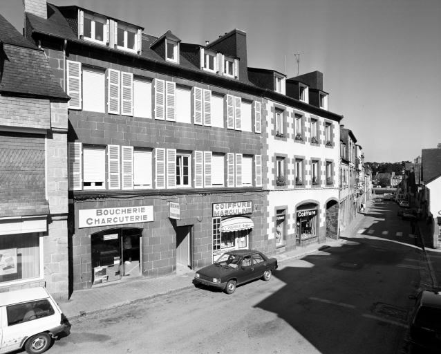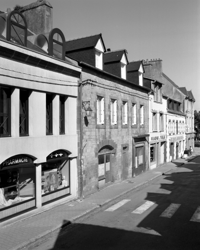 Chronologiquement, la kersantite est présente dans l´ensemble des constructions, mais son emploi est généralement réservé à l´encadrement des portes et fenêtres ou encore, puisqu´elle se prête parfaitement à la sculpture, aux armoiries et marques de marchands, par exemple aux 5 et 21, place des Résistants et Fusillés. Quelque peu délaissée entre la fin du 17e et le milieu du 19e siècle, la kersantite réapparaît dans la seconde moitié du 19e siècle, employée surtout pour l´encadrement des baies et les chaînes d´angle. Deux maisons seulement ont été entièrement construites, vers 1865, en grand appareil de pierre de taille (31 et 40, rue du Général de Gaulle).