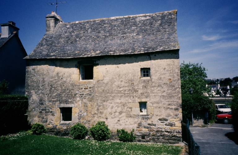 Quelques observations confirment l'hypothèse selon laquelle la mise en place d'un revêtement d'ardoises sur la paroi verticale cachant le bois est un procédé apparu, comme ailleurs en Bretagne, au 18e siècle et s´est généralisé au 19e siècle. Ainsi, pour la partie supérieure de la maison située au 1, place des Résistants et Fusillés, on note l'absence d'un lattis de hourdis indispensable à la fixation des ardoises ; une gravure de 1846 montre un pan de bois apparent et largement protégé par une série d'aisseliers portant un auvent. Dans cette même maison, en travaux lors du recensement, la mise à nu du pan de bois (à l'intérieur) ainsi que la mise en oeuvre des décharges en croix-de-Saint-André confortent, au regard de la gravure, l'hypothèse de l'existence d'un pan de bois apparent sur toute la façade. De même, au 5, place des Résistants et Fusillés et 6, rue de la Rive (dossier), les toits à fermes débordantes et aisseliers courbes coiffés respectivement d'une demi-croupe et d'un auvent à croupe ronde, plaident en faveur d'un pan de bois apparent qui semble ainsi avoir été suffisamment protégé contre l'humidité et le ruissellement des eaux pluviales.