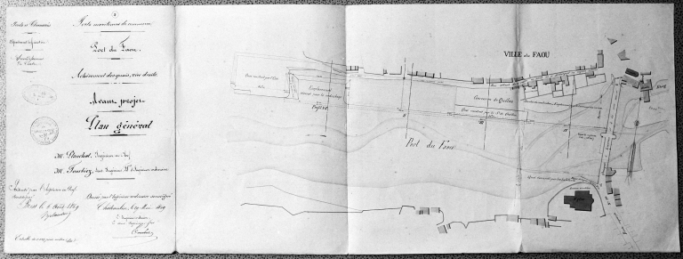 1878-1879 : Prolongement du quai de Quélen jusqu´au pont. Provenance des matériaux : pierre de taille de kersanton de l´Hôpital-Camfrout « dans les meilleurs bancs, du grain le plus serré et sans veine gravelure, fils, délits ni autres défauts ». Les moellons, à défaut de matériaux convenables sur place, proviennent de l´Ile Longue. On fait appel à trois fournisseurs pour le ciment : Knight Bevan et Sturger de Londres, Longuety de Boulogne et Farachon de Gesvres dans le Pas-de-Calais. Le sable provient des grèves de la côte atlantique située entre Bertheaume et l´Aber Ildut.