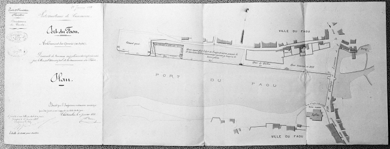 1835 : Construction d´une cale embarcadère (quai de l´ouest). La pierre de taille pour le parement et les moellons de « porphire granitoïde » proviennent d´une carrière située entre le Faou et Rumengol, au hameau de Runjoaïc. Les pierres « pour perrès » proviennent d´une carrière située entre le Faou et l´Hôpital-Camfrout, à une distance de 4 km. La grauwacke est extraite d´une carrière près de la chapelle de Rumengol. On emploie la chaux acheminée depuis Brest.
