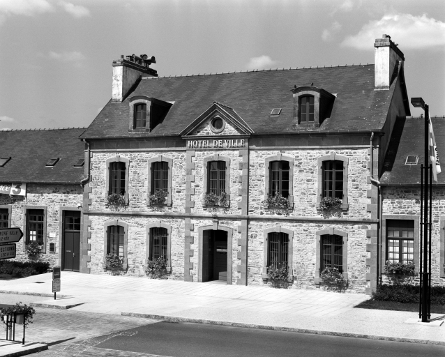 Mairie-école construite en 1886 probablement d'après les plans de l'architecte Joseph Bigot. Ailes latérales rajoutées entre 1904 et 1911.