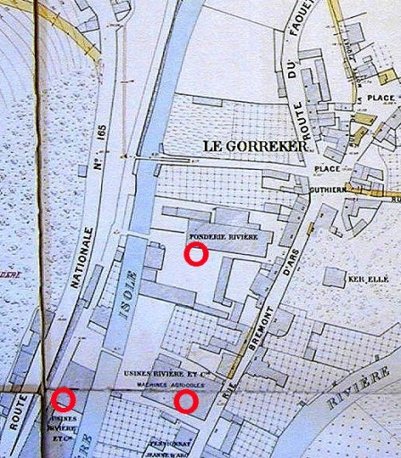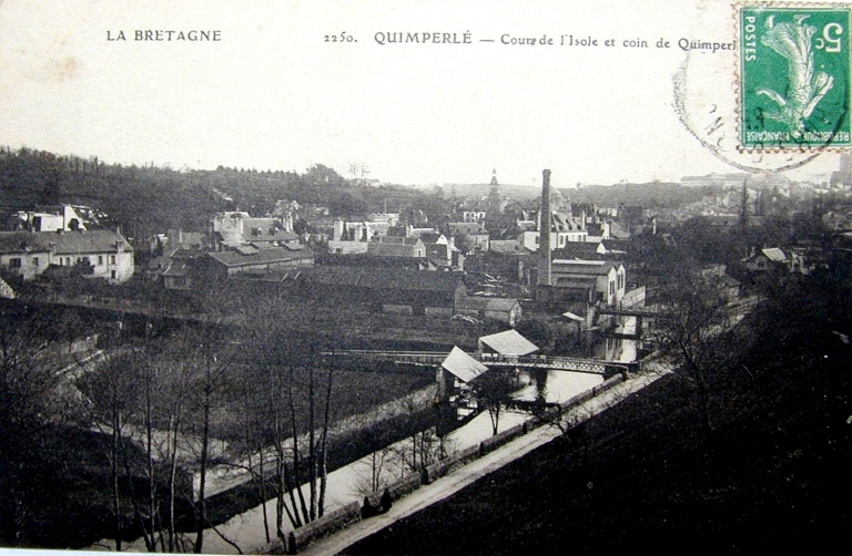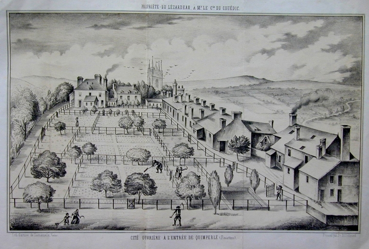 Sous l´Ancien Régime, l´artisanat de Quimperlé ne dépasse guère le cadre local, les activités liées aux moulins mises à part. Peu connue et éphémère, l´installation d´une manufacture de faïence ne dure que deux ans (1763-1765) ; destinée à concurrencer la faïencerie de Quimper, elle fait rapidement faillite, faute de moyens suffisants et de gestion rationnelle et malgré la qualité des pièces produites. Deux ateliers avaient été établis, l´un au Bourgneuf, l´autre aux bords de la Laïta près de Saint-Nicolas. Amorcée dès la seconde moitié du 18e siècle par la modernisation des moulins à eau existantes, l´activité industrielle et artisanale connaît un nouvel essor dans la seconde moitié du 19e siècle, encore favorisé par l´arrivée du chemin de fer en 1863. De ce patrimoine architectural, souvent installé sur des sites occupés auparavant par une activité artisanale plus modeste, peu d´éléments subsistent. Le développement des usines à papier depuis le milieu du 19e siècle grâce aux initiatives de notables locaux et propriétaires terriens conduit, vers 1854, à l´établissement d´une « cité ouvrière » au nord de la ville. Louis-Corentin Du Couëdic fait construire à proximité de ses fermes de Rozglaz et de Kerneuzec des « logements sains pour les ouvriers de la ville ». De l´ensemble, connu par une gravure qui reflète peut-être un état trop idéalisé, ne subsiste que des vestiges dénaturés, dans un secteur entièrement urbanisé à l´époque contemporaine. L´esprit de cette réalisation, précoce et rare dans le département, présente un grand intérêt. Il témoigne d´une conception à la fois paternaliste et hygiéniste de son concepteur : « Je jugeai donc qu´il y avait à réaliser là une amélioration aussi utile à la classe ouvrière qu´avantageuse à moi-même. Les matériaux que j´avais réunis furent alors employés à la construction d´un ensemble de logements commodes auxquels j´attachai quelques hectares de terre. Ces constructions joignent la gaîté de la vue à la salubrité de l´air. Les ouvriers les plus aisés de la ville ont déjà pris possession de ces nouveaux logements et les demandes nombreuses m´engageaient à les continuer pour l´avenir. » La gravure fait état, outre d´un alignement de maisons avec appentis et latrines, d´un lavoir commun et de parcelles clôturées exploitées comme jardins potagers. L´ensemble abrite, en 1855, 189 locataires. Comptant parmi les établissements les plus importants, l´usine de papeterie a fait l´objet d´un dossier individuel. Un autre établissement dont ne subsistent pas de vestiges a laissé son empreinte dans la mémoire foncière et industrielle de la ville, l´usine de matériel agricole Savary et la fonderie Rivière qui, ensemble, ont occupé un site important en basse ville. Alexis Savary, ingénieur, chef d´entreprise, maire de Quimperlé entre 1878 et 1892, puis sénateur du Finistère en 1894, fonde une usine de fabrication de matériel agricole en 1873 et s´associe à la fonderie Rivière peu de temps après. Les ateliers industriels occupent des terrains proches de l´Isole, dans le quartier du Gorréquer. Savary et Rivière diversifient leur production dont la notoriété dépasse le cadre régional en se spécialisant dans la fabrication de mobilier scolaire et de matériels de chemin de fer, de génie militaire, de postes et de télégraphes. Ces ateliers figurent sur des photographies anciennes ainsi que sur le plan de la ville levé en 1925 par Troalen ; ils sont partiellement transférés sur le site de Kergostiou au sud de la gare, puis fermés en 1993. Un abattoir (détruit) est construit en 1882 sur la rive gauche de l´Ellé, près du pont Lovignon ; à cette époque remonte également la construction d´une usine à gaz (détruite) à la sortie nord de la ville. Une laiterie semi-industrielle de dimensions modestes existait à Kerjouannou entre 1892 et 1935. Après 1920, de nouveaux établissements industriels, parfois éphémères (tannerie, cidrerie, conserveries, fonderie) s´installent à la périphérie ouest et nord de la ville, près du quartier du Beaubois et à la sortie nord de la ville. Au déclin d´un grand nombre de ces activités dans les années 1960-1970 répond aujourd´hui l´installation d´un vaste complexe agroalimentaire (abattage et salaisons) implanté à l'ouest de la haute ville.