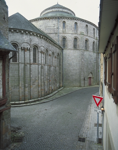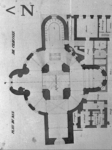 L´édifice est conçu suivant un plan tréflé. La partie centrale en forme de rotonde d´environ 30 mètres de diamètre est composée d´un vaisseau central carré entouré d´un bas-côté annulaire. Quatre bras en croix grecque se greffent sur la rotonde. Le vaisseau central est couvert d´une coupole en pendentifs portée par des piliers puissants entourés chacun de quinze colonnettes engagées dont trois, sur chacune de leurs faces internes, supportent la retombée des arcs de la voûte. Le bas-côté annulaire est couvert de voûtes en berceau supportées par sept colonnettes placées à la face externe des piliers. La partie orientale de l´édifice, en forme d´abside, enferme une crypte semi-enterrée de trois travées couverte de voûtes d´arêtes. L'ancien choeur des moines est couvert d´une voûte en berceau. Le clocher de 1681 était coiffé d´une tour-lanterne de forme carrée en pierre de taille ; sa plate-forme à balustrades portait un tambour octogonal surmonté d´un dôme et d´un campanile en charpenterie. Le pignon ouest est surmonté d'un petit clocher-peigne. Le clocher isolé est couvert d'un toit en pavillon coiffé d'un campanile.