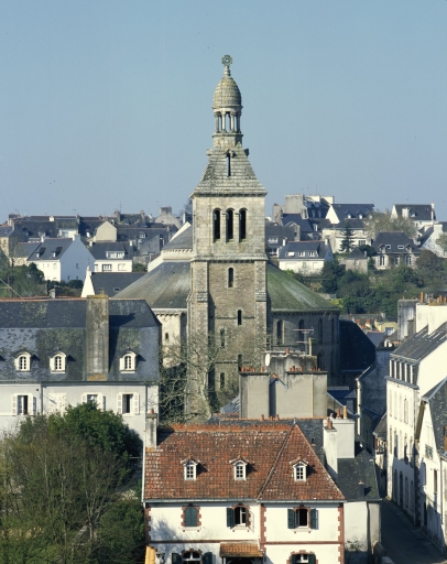 L´abbaye bénédictine est fondée vers 1050 par Alain Canhiart, comte de Cornouaille. Entre la fin du 11e et le début du 12e siècle, son fils Benoît, évêque de Nantes et abbé de Sainte-Croix, est sans doute à l´origine de la construction de l´église, également destinée à abriter le tombeau du premier abbé, Gurloës. De cette époque subsistent, outre le plan, la crypte et la partie inférieure de l´ancien choeur des moines. En 1476, sous l´abbatiat de Guillaume de Villeblanche, modification du bras nord afin d´aménager un accès depuis la rue principale de la ville : remplacement du couvrement de l´époque romane par des voûtes en arc brisé couvertes d´une charpente à chevrons portant fermes, construction d´un pignon découvert côté rue, aménagement d´une terrasse (sans doute réservée aux interventions publiques de l´abbé) accessible par un escalier en vis et mise en place de grandes baies superposées destinées à éclairer les orgues. Vers 1523, l'abbé Daniel de Saint-Alouarn dote l´édifice d´un important mobilier religieux dont témoigne encore un retable en pierre calcaire commandé en 1541 ; à l´origine, il était placé entre les piles nord du vaisseau central, face à la principale porte d'accès depuis la ville. En 1660, le peintre Rome semble réaliser de « belles peintures à la fresque » dans une des chapelles de l´église. En 1665, la congrégation des bénédictins de Saint-Maur prend possession de l´abbaye et initie un renouveau qui affecte surtout les bâtiments conventuels. Entre 1668-1712, à l´initiative de Guillaume Charrier, abbé de Sainte-Croix, reconstruction totale des bâtiments conventuels dont la sacristie qui sera dotée, en 1704, de lambris de hauteur. Entre 1679-1681, suivant le projet de Thomas Jouneaux, prieur de Saint-Croix, mise en place d´une tour-clocher qui, posée au-dessus du vaisseau central, fragilisera l´édifice. En 1728, renforcement des piliers du vaisseau central qui montre des signes de faiblesse depuis la mise en place de la tour. Entre 1730 et 1733, transformation du bras ouest : reconstruction des parties hautes, percement d´une porte d´accès et transfert du retable daté 1541 qui, diminué et restauré, sera placé contre le mur occidental. Réaménagement du vaisseau central (rehaussement du sol, abaissement du bas-côté annulaire, emmarchements, accès latéraux à la crypte), peut-être d´après un projet de l´ingénieur Isaac-René Robelin. Vendue comme bien national, l´abbatiale devient église paroissiale en 1802. Le cadastre de 1824 fait état de logements qui se greffent sur le bas-côté nord. En 1836, les premiers relevés de l´édifice par l´architecte Joseph Bigot précèdent le classement parmi les monuments historiques intervenu en 1840. Afin de sauver le monument roman, Jean-Baptiste Lassus, inspecteur des bâtiments civils, préconise en 1848 le démontage de la tour. Face aux refus de la municipalité et du clergé, on opte pour une consolidation qui n´intervient qu´en 1862. Au cours des travaux de consolidation, notamment le décintrement des échafaudages des doubleaux, la tour s´effondre en mars 1862, causant la mort de deux personnes. La crypte et la partie inférieure de l´ancien choeur des moines ainsi qu´une partie du bras ouest échappent au sinistre. A défaut d´étaiements, le bras nord du 15e siècle s´effondre à son tour, alors que l´architecte des monuments historiques, Emile Boeswillwald, avait plaidé en faveur de sa conservation. Les archives des monuments historiques et les archives diocésaines de Quimper conservent une série de relevés et de photographies qui permettent de connaître les éléments majeurs de l´édifice avant leur disparition complète et de mesurer l´ampleur des dommages. Une série de onze chapiteaux de pierre calcaire est conservée au musée départemental de Quimper, d´autres ont été remployés dans plusieurs églises des environs (Saint-David, église de Tréméven). Selon les dossiers de la reconstruction, peu de chapiteaux d´origine sont encore en place, la crypte mise à part. Entre 1864 et 1868, sous la direction de Boeswillwald, la reconstruction est confiée à Joseph Bigot, secondé par son fils Gustave. Sainte-Croix devient alors le plus important chantier de ce type jamais réalisé dans le département. A l´exception de la crypte et d´une partie du choeur des moines, Bigot reprend le monument depuis ses fondations et en fait un édifice néo-roman. Il fait également rehausser le sol du vaisseau central en inventant une plate-forme accessible par des escaliers latéraux et crée, par le changement des niveaux, un nouvel espace voûté très bas par lequel on accède désormais à la crypte. Vers 1880, mise en place d´un clocher-peigne à l´ouest, probablement d´après le dessin de Joseph ou Gustave Bigot. En 1903, construction d´une tour-clocher isolée de style néo-roman à l´est du chevet d´après le dessin du chanoine Jean-Marie Abgrall.