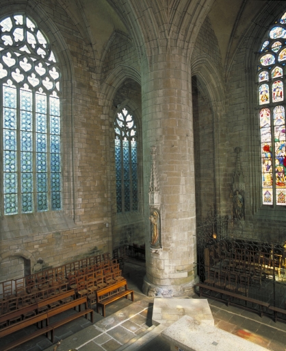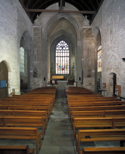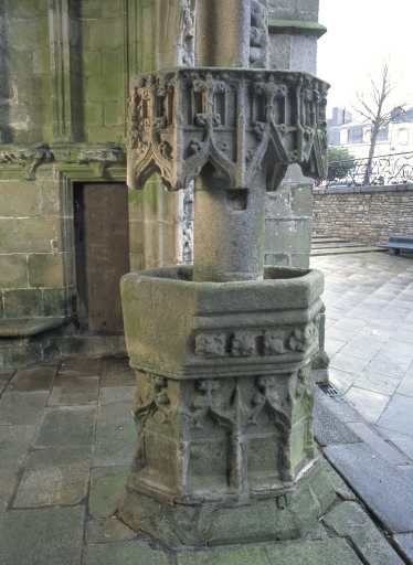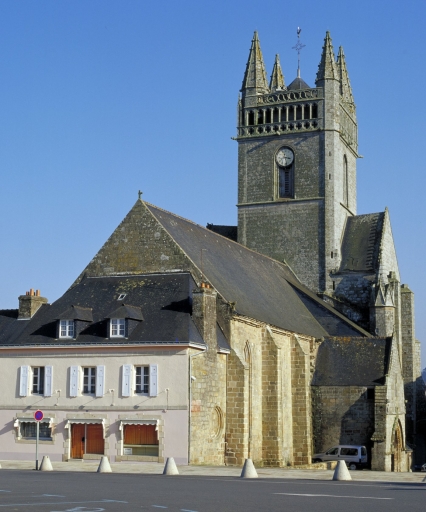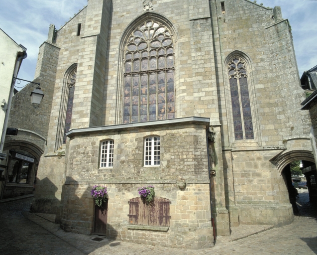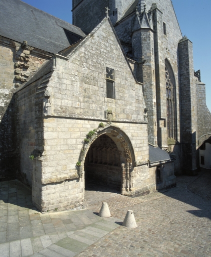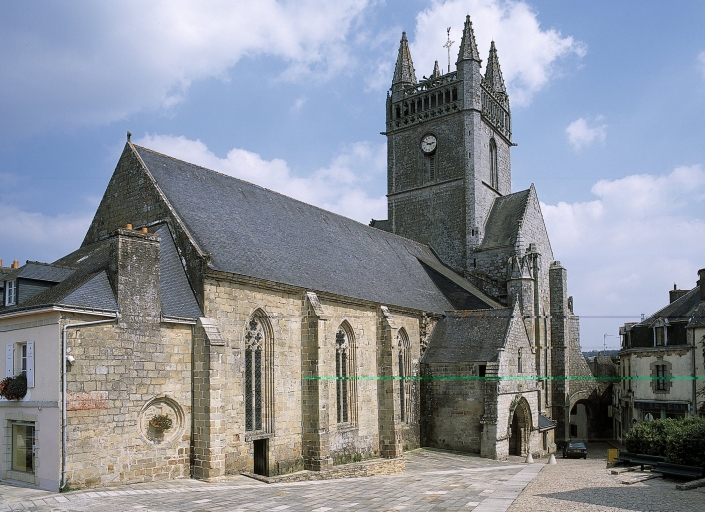 Cette ancienne chapelle de la communauté des bourgeois domine la ville haute et sa place principale destinée, depuis l´époque médiévale, aux foires et marchés. Les deux principales campagnes de construction sont immédiatement perceptibles. La partie orientale dominée par la tour massive couronnée d´une galerie ajourée cantonnée de clochetons, correspond à un seul parti architectural et montre des parentés évidentes avec les tours de la cathédrale de Quimper et des églises de Locronan, du Folgoët et de Pont-Croix. Sans égale en Bretagne occidentale, la partie orientale de l´édifice, conçue suivant un plan carré abritant la croisée faisant fonction d´avant choeur, le transept non saillant et le choeur à chevet plat flanqué de chapelles latérales, est une conséquence des contraintes de la morphologie urbaine, notamment du terrain en forte déclivité nécessitant la mise en place de contreforts puissants. Curieusement placé au nord, le grand porche, dont l´étage servait de maison commune et de lieu de réunion de la fabrique, est animé par un pilier central richement sculpté à usage de bénitier. Comme à Kernascléden, Sainte-Noyale et Saint-Fiacre du Faouët, ce porche est l´illustration d´un même modèle proposé par un atelier qui sait maîtriser harmonieusement les volumes et le décor monumental du gothique flamboyant. Le choix d´établir le porche majeur au nord, rare en Bretagne, semble indiquer la préexistence, au sud, d´un porche plus ancien déjà en place. Suite à la construction du porche nord, l´accès ouest devient alors caduc et des constructions civiles, plusieurs fois remaniées, s´appuient contre le mur-pignon. Réalisation majeure de l´art gothique en Cornouaille, cette grande église urbaine, à travers la monumentalité et la qualité décorative de sa partie orientale, illustre bien, en ce début du 15e siècle, l´impact du mécénat ducal auquel s´associe celui des autorités ecclésiastiques et civiles dont témoigne l´omniprésence de décors héraldiques.