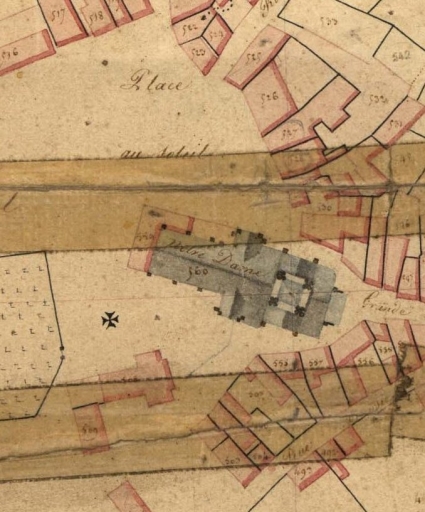 Dédiée à Notre-Dame, cette ancienne chapelle de la communauté des bourgeois de la ville prendra également le vocable de Saint-Michel en souvenir de l´ancienne église paroissiale voisine ruinée en 1765. On distingue, pour l´essentiel, deux campagnes de construction. D´un premier édifice bâti vers 1280 ne subsistent que les murs de la nef percés de baies et de grandes portes au nord et au sud et sans doute les traces d´un porche ouest (oculus sud), les autres parties ayant été ruinées au cours des guerres de Succession qui touchent la ville au milieu du 14e siècle. A la charnière des 14e et 15e siècles, une reprise hésitante et par endroits malhabile débute par la reconstruction du porche sud qui remplace un porche plus ancien probablement à étage, comme l´indique une porte haute bouchée qui pourrait correspondre à l´accès à un jubé de l´édifice originel. Egalement témoins du début de la reprise du chantier, les piliers ouest de la croisée du transept, cantonnés de colonnettes à chapiteaux, se greffent sur des piles carrées qui semblent correspondre à l´emplacement de l´ancien choeur. Une campagne d´agrandissement décisive, affectant le couvrement de la nef et surtout la construction de la partie orientale de l´édifice, débute en 1416 ou 1418 et se termine au milieu du 16e siècle. Grâce aux libéralités du duc Jean V, de Henry de Lespervez, l'abbé de Sainte-Croix de Quimperlé et de familles bourgeoises et aristocratiques de la ville (leurs armoiries figurent aussi bien à l´extérieur qu´à l´intérieur), le chantier inclut la mise en place du porche nord (achevé en 1425), de la charpente de la nef (datée 1430), de la partie orientale de la croisée du transept (piliers circulaires portant des voûtes à pénétration directe), du massif de la tour et du choeur dans lequel est inhumé Henry de Lespervez en 1434. La réalisation d´un jubé placé entre la nef et la croisée du transept, accessible depuis un escalier en vis logé dans la tourelle desservant également les parties hautes de la tour, demeure, en l'absence de traces de fixation, incertaine. Ce n´est qu´entre 1520 et 1550 que la croisée faisant fonction d´avant choeur, le transept non saillant et le choeur à chevet plat flanqué de chapelles latérales sont couverts de voûtes d´ogives. Depuis le 16e siècle, la tour abritait, en guise de beffroi, l´horloge de la ville qui était pourvue d´un mécanisme mettant en mouvement une statue de saint Michel ; détruite en 1590, elle a été rétablie en 1620. En 1636, Dubuisson-Aubenay mentionne l´édifice dont il vante le «fort haut et beau clocher couvert en plomb en 1621, comme il est écrit dessus en lettre noire». Ce clocher, construit sous Jean-François-Paul Gondi, abbé de Sainte-Croix et démoli en 1763, figure sur un dessin de 1736. Construite dans le prolongement du chevet, la sacristie, à usage commercial au niveau de la rue, date de la fin du 18e siècle, tout comme la maison qui s´appuie sur l´élévation ouest remaniée à plusieurs reprises. En 1862, l´architecte Joseph Bigot, de Quimper, avait noté la fragilité de la tour légèrement inclinée ; toute construction d´une flèche mettrait en danger sa stabilité à cause de l´état de la maçonnerie «posée en argile avec des moellons plats dont le tassement fatigue le parement extérieur en taille de grand appareil». Les travaux de Bigot ne concernent que la consolidation de la tour et le rejointoiement, «en ciment de Portland», des parements intérieurs situés au-dessus des voûtes.