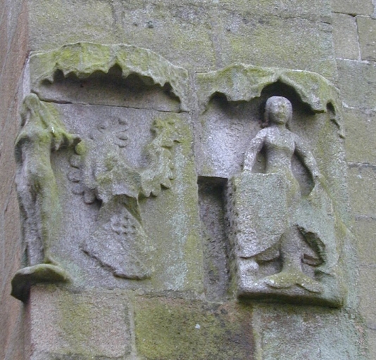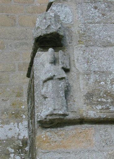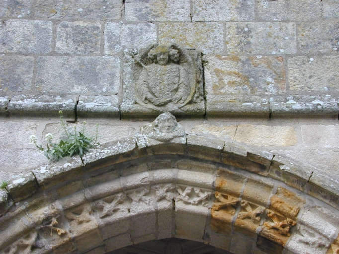Armoiries de Bretagne : sablière nord de la nef et porche nord. Armoiries, probablement Lespervez : porche nord. Armoiries non identifiées : porche sud, charpente de la nef, clés de voûte des chapelles latérales. Sirène présentant un écu fruste (élévation nord). Ange présentant un écu fruste (porche sud).