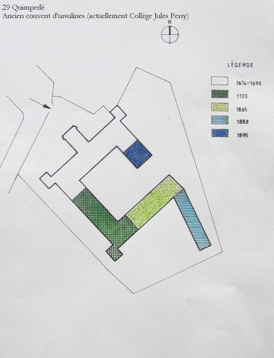 Les parties construites dans la seconde moitié du 17e siècle partagent, avec les autres établissements d´ursulines en Bretagne, une même conception architecturale issue de la Réforme catholique et largement promue par les jésuites. Elément fort, l´église s´ouvrait vers la ville, alors que le vaste espace conventuel, clos de murs, en était symboliquement et matériellement séparé. L´église présente des analogies évidentes avec celle - contemporaine - des ursulines du Faouët (Morbihan) alors que le cloître se compare à celui, contemporain, de l´abbaye Sainte-Croix de Quimperlé. Malgré un certain nombre d´agrandissements et de modifications, l´ensemble a conservé sa structure d´origine, des éléments intérieurs intéressants (cheminée, escaliers, charpente) et, ce qui est rare, sa vocation première d´enseignement. Les interventions des architectes Joseph Bigot et Jules Loire ainsi que celle du chanoine Abgrall à la fin du 19e siècle aboutissent à un doublement des constructions existantes et font de l´ancien couvent d´ursulines un des plus grands établissements scolaires du sud du département. Certaines pièces dont la conservation s´impose, gardent la mémoire d´un usage temporaire durant la Seconde Guerre mondiale.