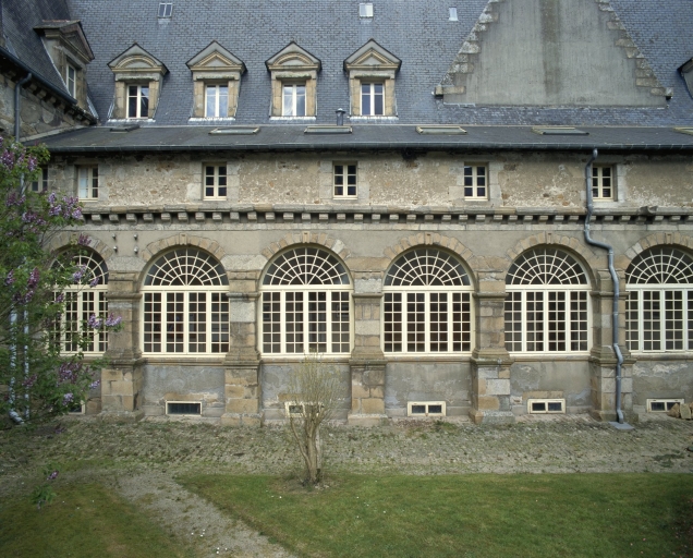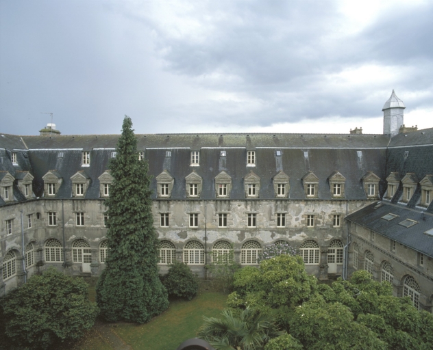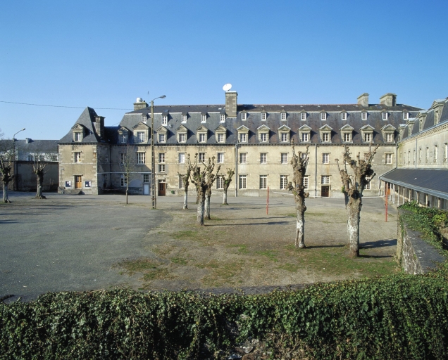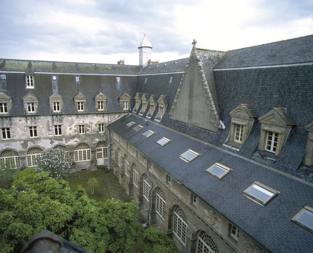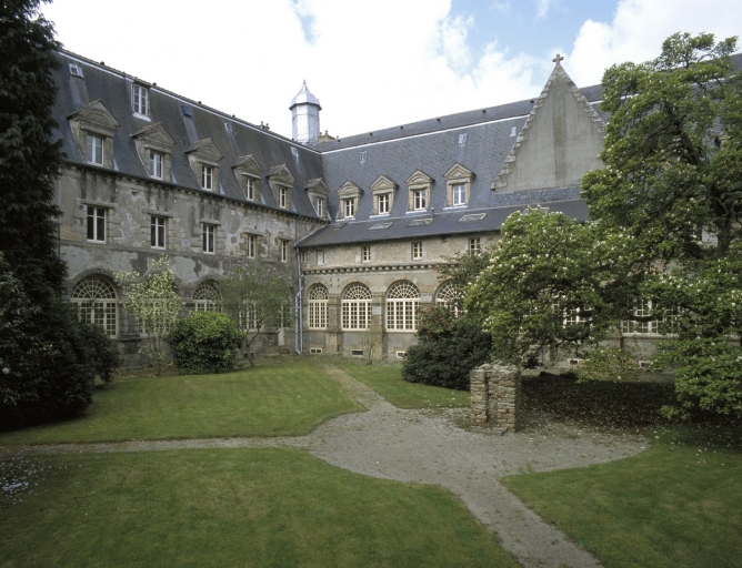 Les bâtiments conventuels du 17e siècle, construits suivant un plan en U, sont cantonnés, aux extrémités est et ouest, de deux pavillons. Deux courtes ailes en retour d´équerre abritent les deux cages d´escalier de la première campagne de construction.Tous les corps de bâtiment comptent un étage carré et un étage de comble. L´aile est et la partie est de l´aile nord, bâties sur un terrain en déclivité, possèdent un étage de soubassement ; celui situé dans l´aile nord, également accès principal de l´ancien couvent, abrite les anciens parloirs (actuellement caves et pièces de service). La chapelle qui s´élève, en retour d´équerre, au nord des bâtiments conventuels, communiquait, à l´origine, avec le cloître situé au sud (baies bouchées). Disparue, l´ancienne chapelle latérale est, formant faux-transept, figure sur une photographie ancienne. L´ancien choeur des religieuses est séparé de la nef par un arc diaphragme qui était, au début du 20e siècle, muni d´un remplage en bois, d´une grille à claire-voie et de volets ; l´arc conserve les vestiges d´un décor peint (décor floral). S´ouvrant sur un préau planté, le cloître à trois galeries est couvert de fausses voûtes d´arête en plâtre. Un pilier sud du cloître porte l´inscription « IHS divine providence fondement et soutien de ce monastère 1720 ». D´autres piliers (sud et est) portent les dates 1865 et 1895 et les noms de personnages vénérés (Joseph, Joachim, Anna, Ursule, Charles, Ignace, Roch, Louis de Gonzague, Angèle, Antoine, Corentin).