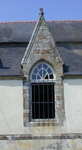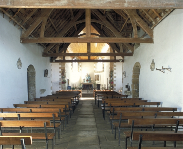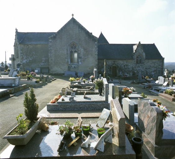 Edifice de plan en croix latine avec clocher-porche hors oeuvre dont le plafond moderne en béton porte la chambre des cloches. Clocher-tour à essentage couvert d´un toit en pavillon. Un bénitier est creusé dans le pilier ouest du porche. Pignon ouest découvert. Fenêtres hautes passantes en lucarne à crossettes partiellement sculptées. Chevet à trois pignons dont un aveugle. Gros-oeuvre en pierre de taille de granite à l´exception des parties remaniées au 19e siècle, en moellon enduit. Encadrement des baies en granite. La différence de hauteur entre la nef, très basse, et les autres parties de l´édifice, est matérialisée par des charpentes individuelles, de type à chevrons portant fermes pour la nef. Sol couvert de dalles de granite avec remploi de plusieurs pierres tombales érodées. Cheminée dans le mur ouest indiquant probablement l'emplacement d'anciens fonts baptismaux (disparus).