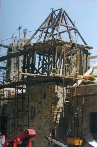 Gros-oeuvre en moellon de granite et de schiste couvert tardivement d´un enduit imitant la pierre de taille pour les chaînages d´angle et les baies. Partie supérieure de la tour d´escalier en pan de bois à encorbellement avec essentage d'ardoise. On signale la présence de boulins à pigeons dans la partie supérieure maçonnée de la tour. Toit à longs pans, à l´exception de la tour d´escalier, couverte d´un toit en pavillon. Escalier en vis en bois. Souche de cheminée ouest supprimée. Partie nord du rez-de-chaussée à usage d´anciennes étables à chevaux. Partie sud du rez-de-chaussée à usage commercial. Premier étage et étage de comble réservés à l´habitation. Intérieur non vu.