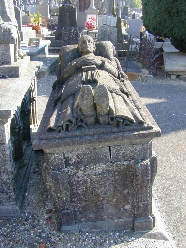 Ensemble de deux sépultures en formes de tombeaux signés Larhantec, Landerneau. Le prêtre François Mazé (tombe 1) est représenté en ronde bosse, agenouillé et en prière, devant une croix isolée placée au pied de la sépulture. Inscription gravée sur la face sud : « La piété des fidèles érige ce monument à Mr Mazé, curé archiprêtre de Quimperlé pendant 36 ans. 1869 ». Le prêtre François-Marie Quéméneur (tombe 2) est représenté en gisant. Inscription gravée sur la face sud : « Hic resquietat Franciscus Maria Quemeneur Archipresbyter Canonicus Rexit Parochiam Sanctae Crucis Annos XV Vixit Annos XV Obut Anno MDCCCLXXXIV Mense Aprili Die XXVIII In Pace ».