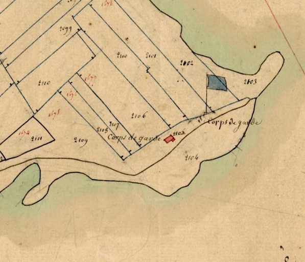 Batterie couverte d'un toit en terrasse. Logis couvert d'un toit à croupe.