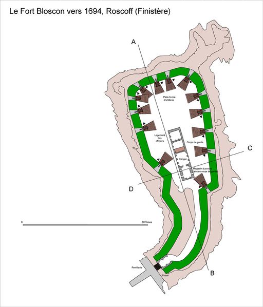 Le 30 octobre 1694, des retranchements sur une longueur de 6 lieues (de Roscoff à Pempoul, et de Morlaix à la rivière de Lannion) sont d´ores et déjà achevés tandis que les travaux du fort Bloscon à Roscoff se poursuivent. Construit en deux mois, le fort se compose d'une batterie engazonnée dotée de 13 embrasures, d'un corps de garde avec son mât de pavillon (pour communiquer avec les autres points fortifiés ou pour donner l’alarme), d'un magasin à poudre et d'un magasin d'artillerie. La gorge du fort, séparée du continent par un fossé sec, est fermée par une palissade et un pont-levis. Le bois du pont-levis est acheté grâce à l'argent collecté par monsieur de Trofagan, gouverneur des villes de Saint-Pol-de-Léon, de Roscoff et de l'île de Batz. La garnison du fort a pour mission de protéger, grâce à ses pièces d’artillerie, l'entrée du port de Roscoff et le chenal de l'île de Batz.