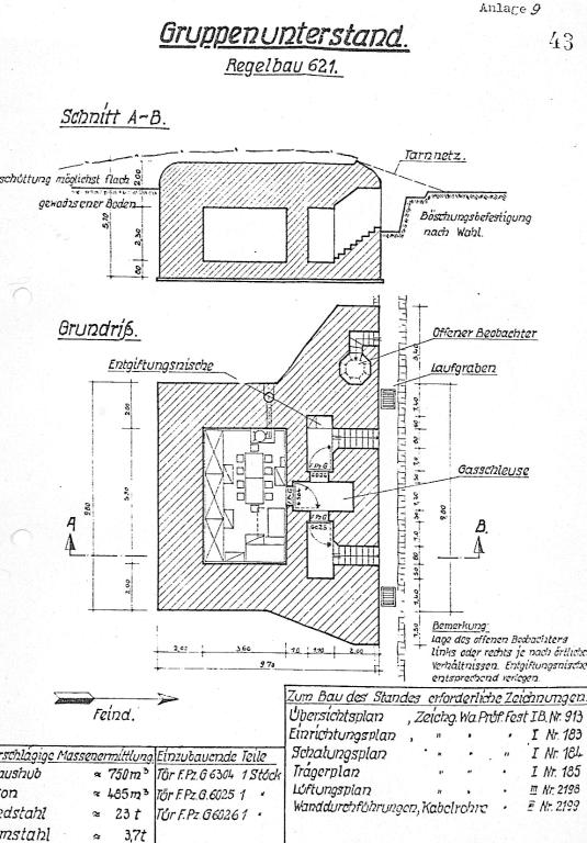 Selon le catalogue des plans-types, la réalisation d'un bunker - casemate de type 621 (Gruppenunterstand) a nécessité 410 m3 de béton, 23 t de fer rond et 3,7 t de fer profilé.