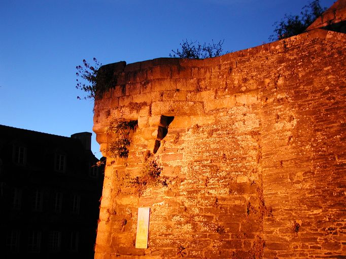 Rue de l’Hospice, la fortification construite en pierre de taille et d’une épaisseur de près de 2 m est couronnée par un chemin de ronde doté de mâchicoulis de type breton (trois assises à ressauts latéraux en quart de rond faisant pyramide inversée). Le parapet a été démantelé mais sa partie haute reconstruite.