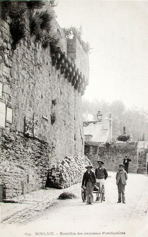 Morlaix, le Mons Relaxus, le mont délaissé, occupe une position remarquable au fond d’une baie et d’un estuaire à qui elle a donné son nom. Un château fort y aurait implanté dès le 11e siècle et devient au milieu du 12e siècle la principale forteresse des vicomtes de Léon qui y ont fondé trois prieurés. Devenue ducale, la cité est vraisemblablement fortifiée entre le Jarlot et le Queffleut à la fin du 12e siècle. La fortification d’agglomération est reconstruite au 15e siècle. Au 16e siècle, elle passe dans les mains du roi de France mais reste entretenue par la ville grâce aux impôts et billots. Elle est restaurée dans le contexte de la Guerre de la Ligue en Bretagne (1588-1598). Le château médiéval est également modernisé à la fin du 16e siècle par l’ajout de cinq bastions qui apparaissent sur le plan schématique de la ville de Morlaix de 1636 de Dubuisson-Aubenay. Non entretenue au 18e siècle, remployée par des personnes privées qui y adossent leur demeure, la fortification d’agglomération de Morlaix est partiellement détruite au 18e siècle et dans la première moitié du 19e siècle à l’exception d’une portion située rue de l’Hospice.