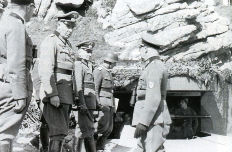 Lors de sa tournée d'inspection sur le point d'appui codé Wn Mo 56 de la pointe de Primel à Plougasnou, le général allemand Friedrich Dollmann (1882-1944, responsable de la défense de la Bretagne et de la Normandie) est accompagné par le général Erich Straube, commandant le 74ème corps d´armée.