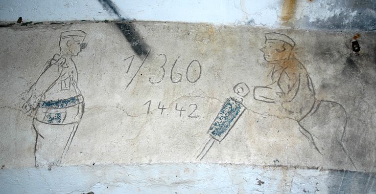 Certains bunkers de cet ensemble fortifié sont numérotés (n° 9 à l’entrée d’une petite casemate située entre des tranchées de communication ; n° 12 à l’entrée d’un bunker - poste d’observation et de tir). L’un des Tobruk-stände - celui situé à proximité du poste de direction de tir de construction française - comporte un nom et un prénom. Enfin, la chambre de tir de la quatrième casemate (celle située le plus à l´est) abrite une inscription réalisée dans le béton frais représentant un chef "bedonnant" en uniforme (sans doute un Pionier, soldat allemand appartenant à une section spécialisée dans les travaux de construction, de terrassement et de manutention) et un soldat, également en uniforme, travaillant avec un marteau-piqueur. Elle s’accompagne de l’inscription "1/360" et de la date "1.4.42". Le bunker enterré de type M151 abrite également des peintures murales.