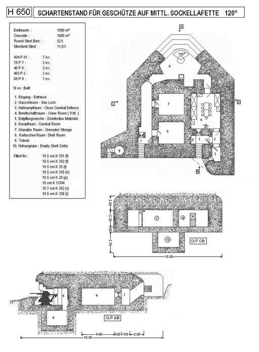 Selon le catalogue des plans-types, la construction d'un seul bunker - casemate de type 650 nécessite 1080 m3 de béton, 52 tonnes de ferraillage et près de 12 tonnes de fer profilé.
