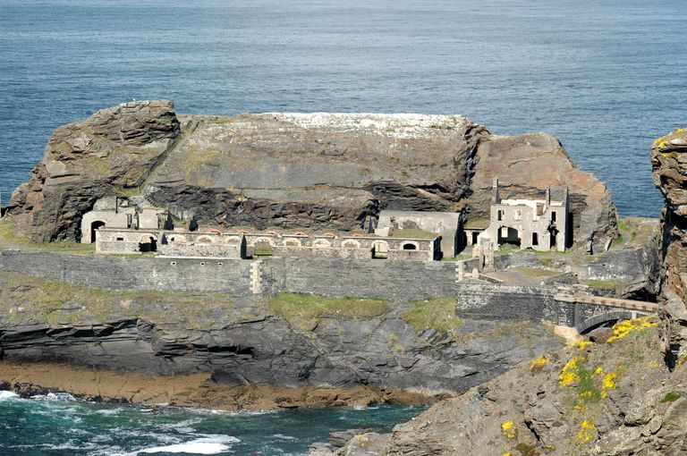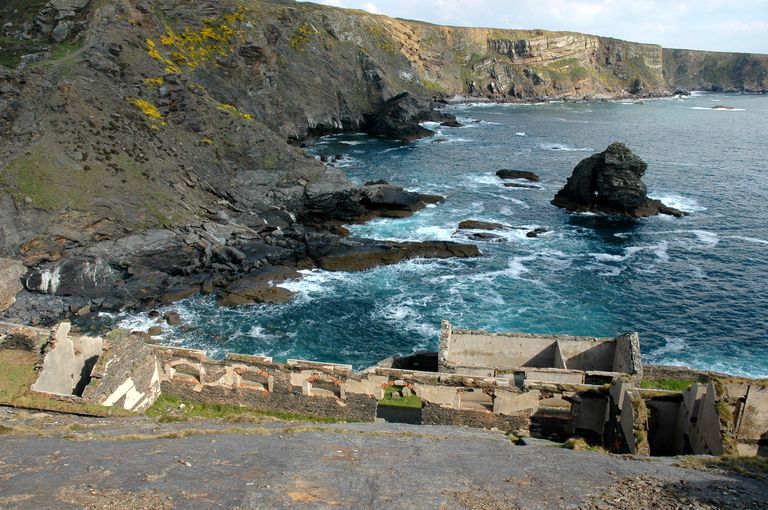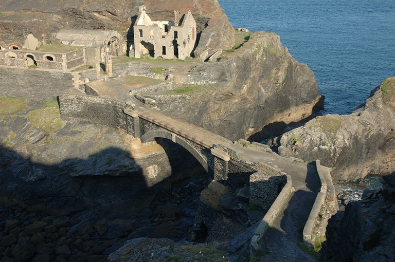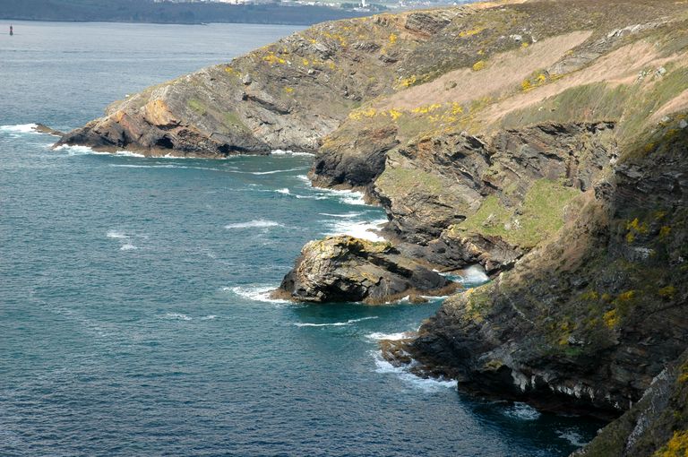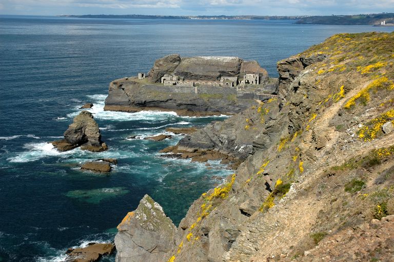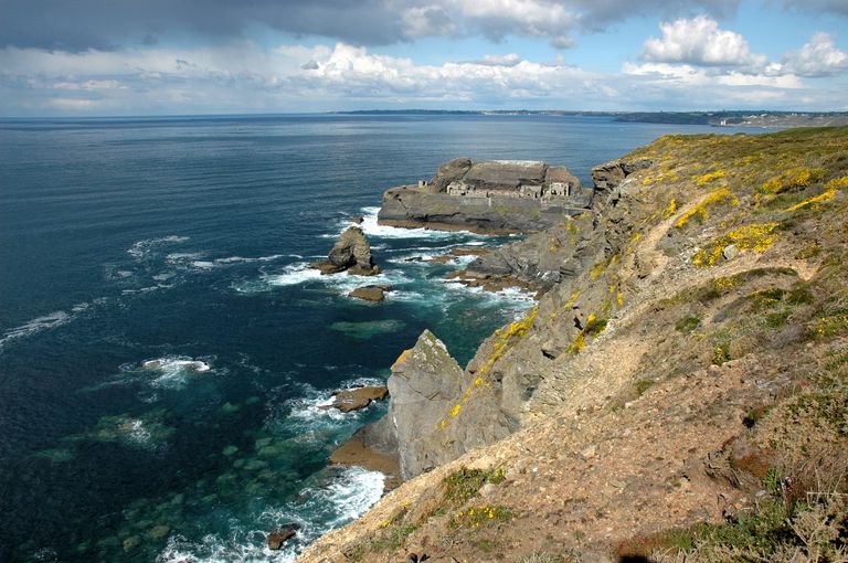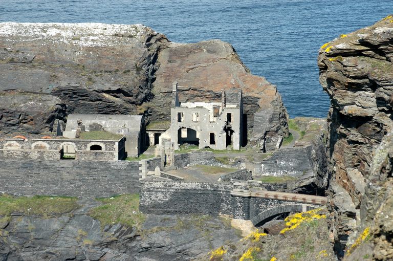 Matériau constitutif du site : falaise en schiste et quarzite de Plougastel. L'ilot est un monolithe en schiste ardoisier presque noir.