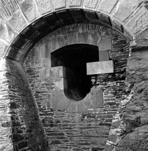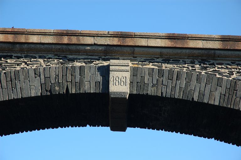 Voûte surbaissée en schiste. Têtes saillantes appareillées à deux rangs de claveaux à joints contrariés. La clé est constituée par un monolithe de granite clair portant gravée, sur la face d'extrémité nord "GM" (génie militaire) et sur la face sud "1861" surmontée de deux moulures.