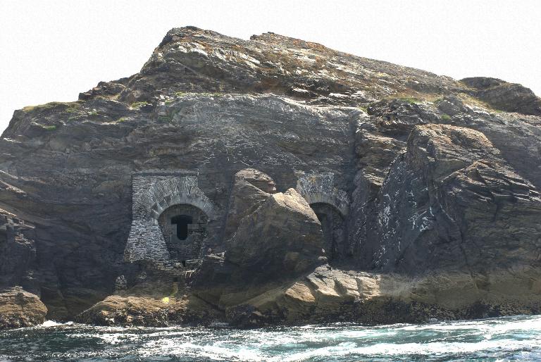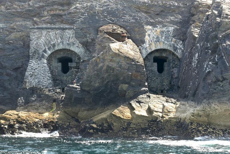 L'embrasure proprement dite, en forme de T est entourée de pierres de taille dressées, en granite de l'Aber-Ildut. Il a été nécessaire de procéder, à des entailles profondes dans le roc en avant des embrasures pour délarder les champs de tir car, pour obtenir une couverture verticale suffisante, les casemates devaient être établies en retrait mais le plus bas possible sur l'eau. L'accès à la batterie se fait par galerie ascendante et escalier à proximité de la porte d'entrée de l'îlot.