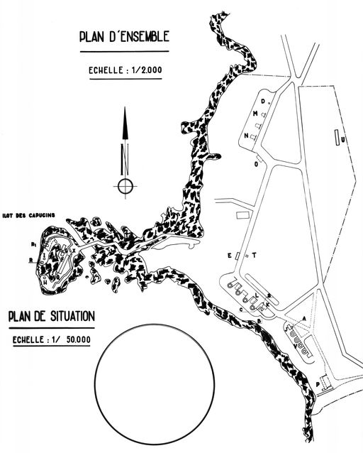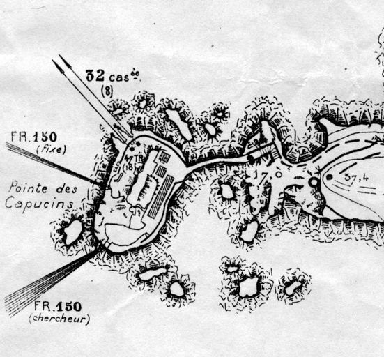 - Au sud, à 500 mètres environ de la pointe la batterie de mortiers des Capucins et ses annexes.