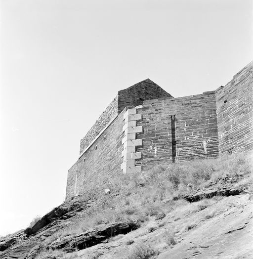 L'escarpe est construite en maçonnerie de moellons avec chaînes d'angles en pierres de taille (granite gris clair) dressées et harpées, à chaque brisure saillante du tracé. Le parapet est surmonté d'une tablette en pierre de taille. Sur la partie avant, l'enceinte est constituée par le parapet de la batterie, et le roc franc raidi.